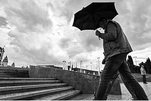 A cloudy sky and a contrasting silhouette of a man with an umbrella.