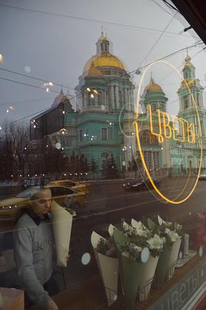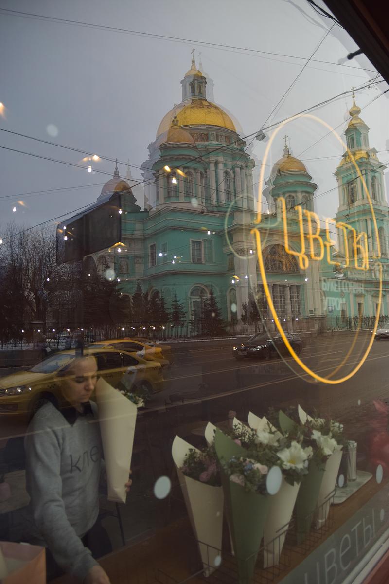 Flowers, a beautiful girl and a reflection in the glass of an Orthodox Church. It beautiful
